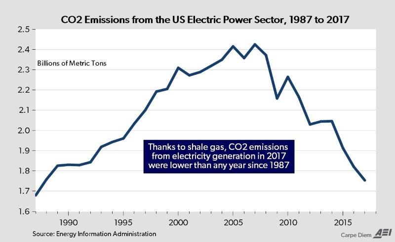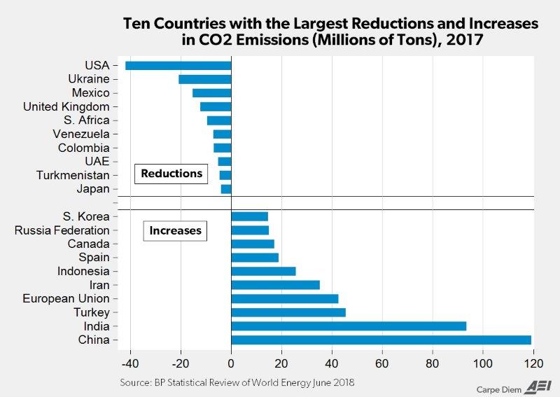 Two charts from the American Enterprise Institute’s Mark J. Perry help illustrate, using data gleaned from BP’s Statistical Review of Global Energy, that the U.S. led the world in reducing carbon dioxide emissions in 2017: