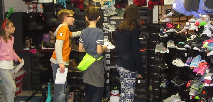 Montrose business owner Adam Diaz and family recently sponsored an unprecedented project in the Montrose Area School District. Approximately 650 children at the Lathrop Street and Choconut schools in grades K through 6 were given free footwear, hats and gloves. Over the course of Dec. 11 to 13, students were led one class at a time to a room set up convincingly as a retail store. Teachers, Diaz family members, and employees of the New Shoe Store Plus fitted 10 pupils at a time and sent them on their way with the new apparel.