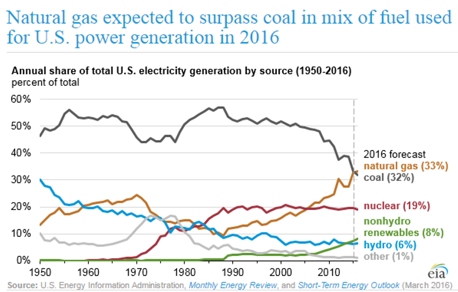 Just one week ago the U.S. Energy Information Administration (EIA) reported that 2016 will be the first year that natural gas will exceed coal in producing electricity on an annual basis. This is big news. You might remember the announcement almost one year ago in April 2015 that natural gas would surpass coal on a monthly basis. The trend has continued and EIA’s 2016 forecast has natural gas generating 33% of U.S. electric generation compared to coal’s estimated 32%.