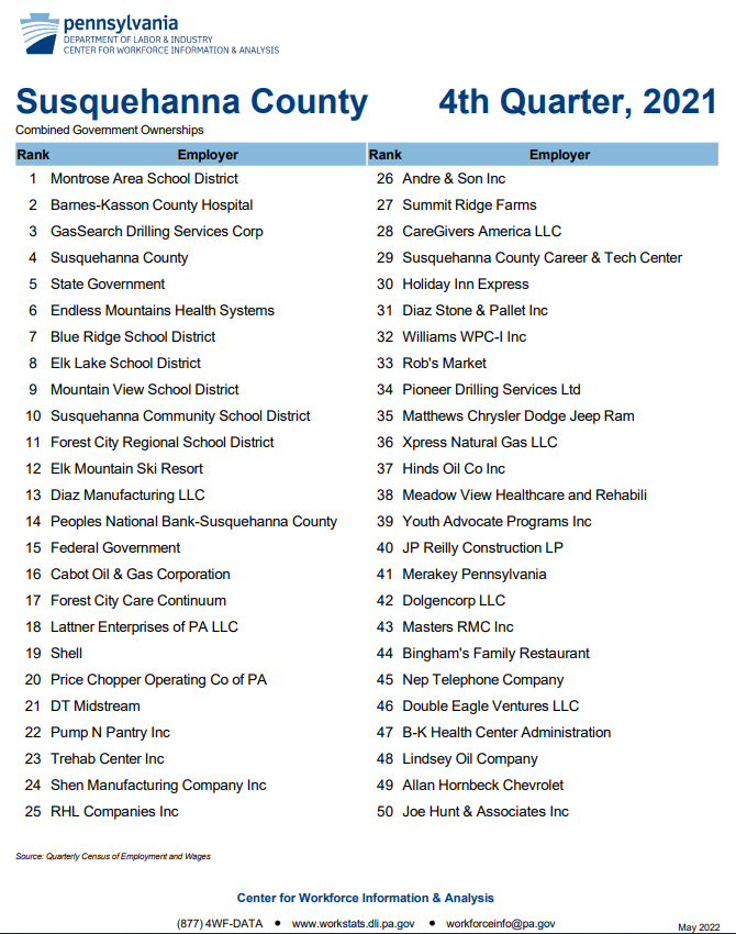 In Susquehanna County, six companies directly or indirectly involved in natural gas production were among the top 50 employers in the fourth quarter of 2022, with GasSearch Drilling Services, a wholly-owned subsidiary of Coterra, securing the number 3 spot and Coterra itself, which relies heavily on other local contractors on the list, at number 13.