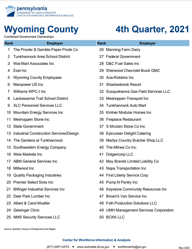 Williams has a strong presence in all three counties, leading the energy sector list in Bradford and Wyoming counties, landing the number 7 spot overall in the latter. Southwestern Energy Company with headquarters in Wyoming County is at number 15 there. Support companies, such as Mountain Energy Services and Susquehanna Gas Field Services are also consistent employers in Wyoming County.