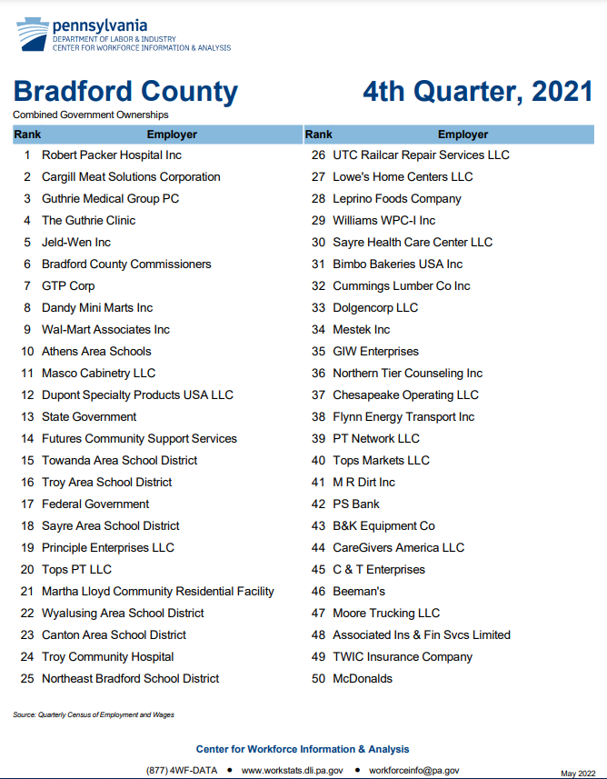 Bradford County offers a more diverse industry portfolio, but natural gas companies like Chesapeake and support industries like Williams Midstream still make solid showings.