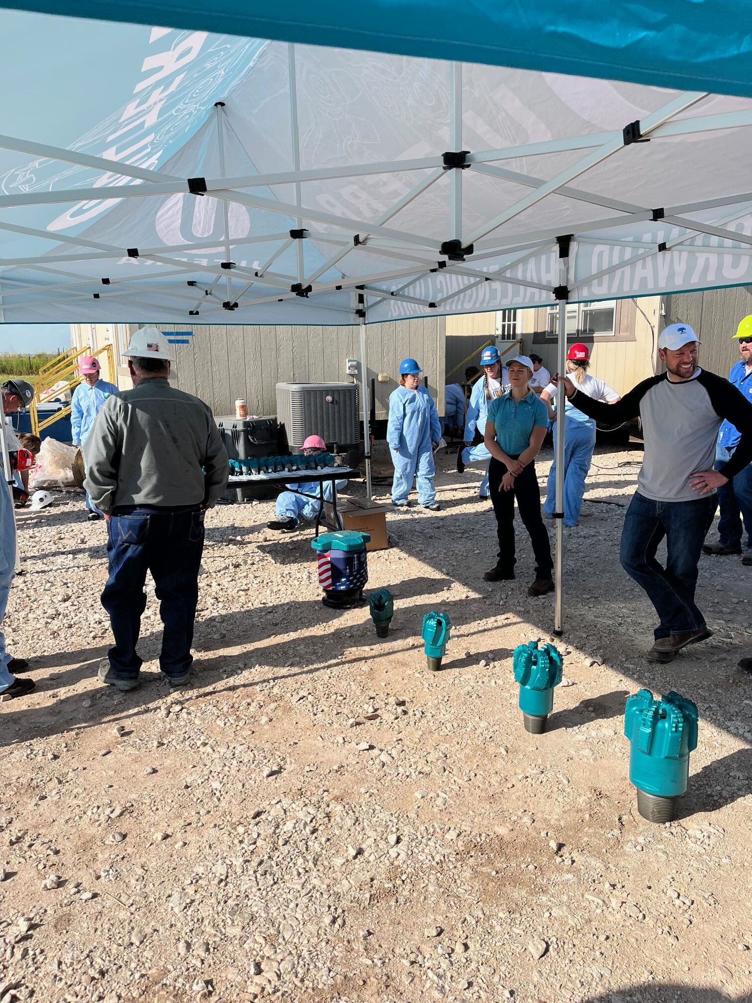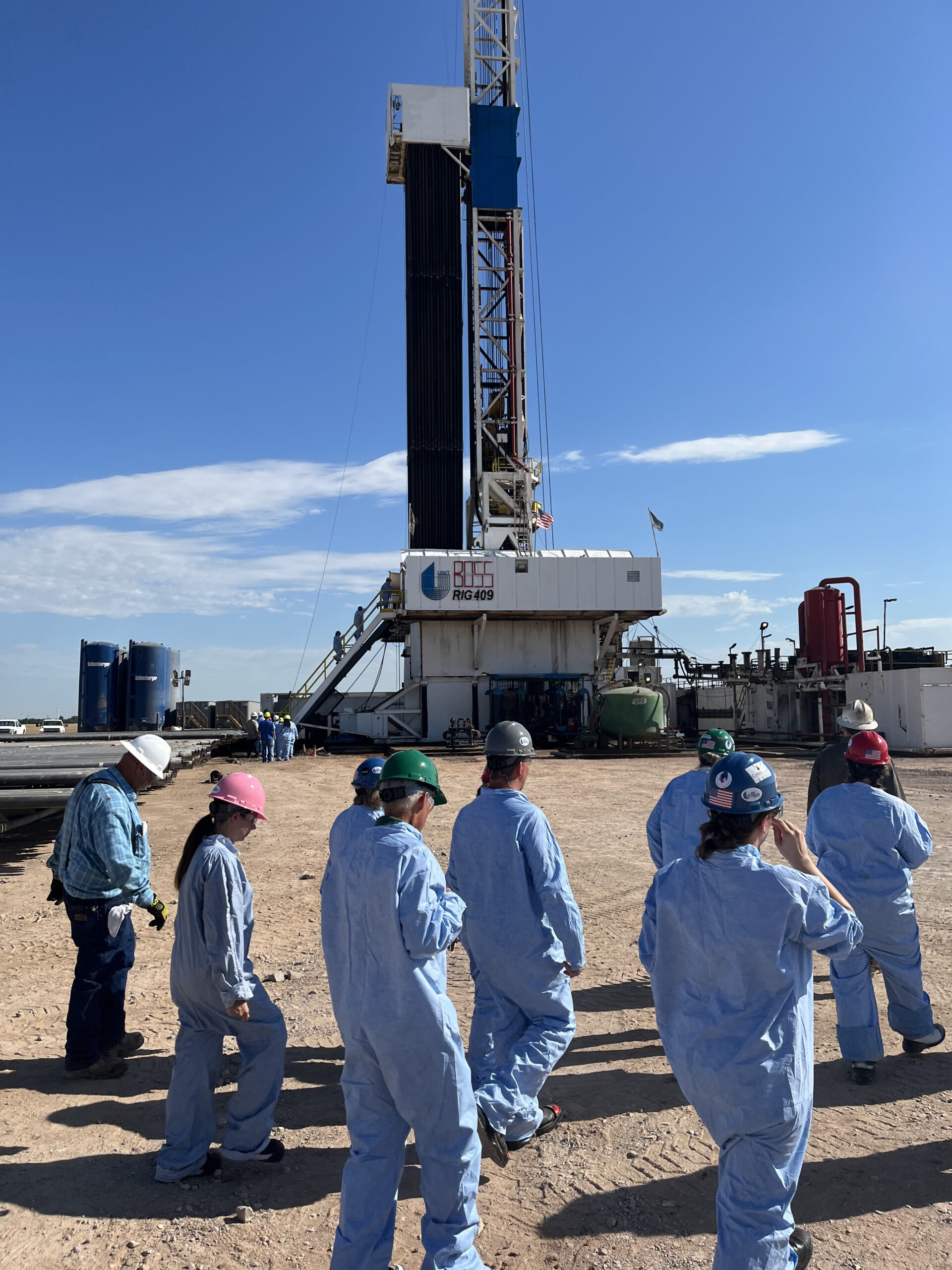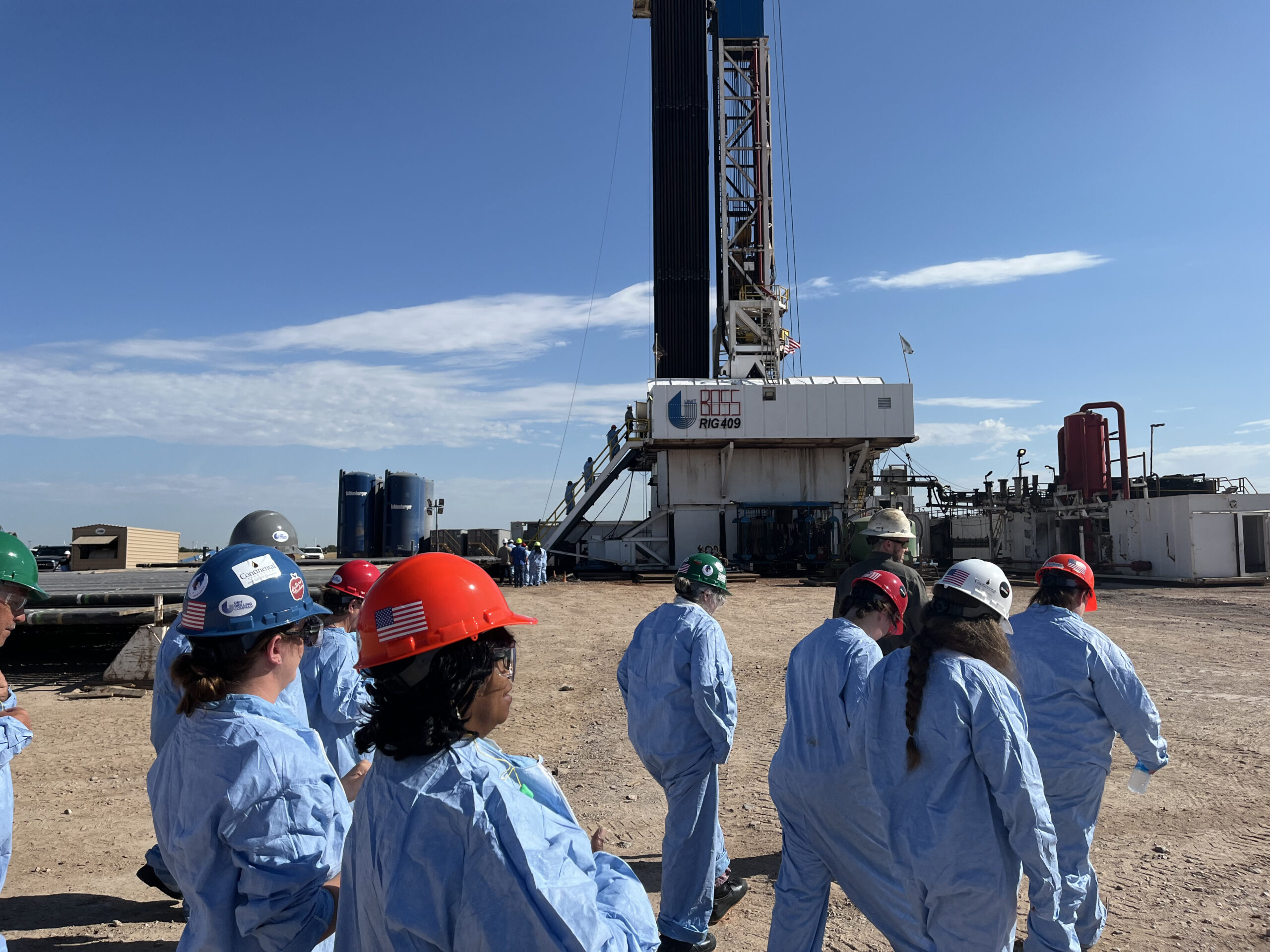 Because of the size of the group Unit Drilling and Coterra personnel divided the group and proceeded to tour them around the location focusing on site construction, environmental protection, drilling technology, the rig floor, doghouse, backyard, rig walking package, casing, drill bits, and mud motor technology. All participants were outfitted with proper PPE and FR clothing and went through a detailed safety briefing and drilling 101 before entering the site. Coterra worked with Unit and OERB to ensure cooling stations, water, and other precautions were available to manage the excessive heat on site.