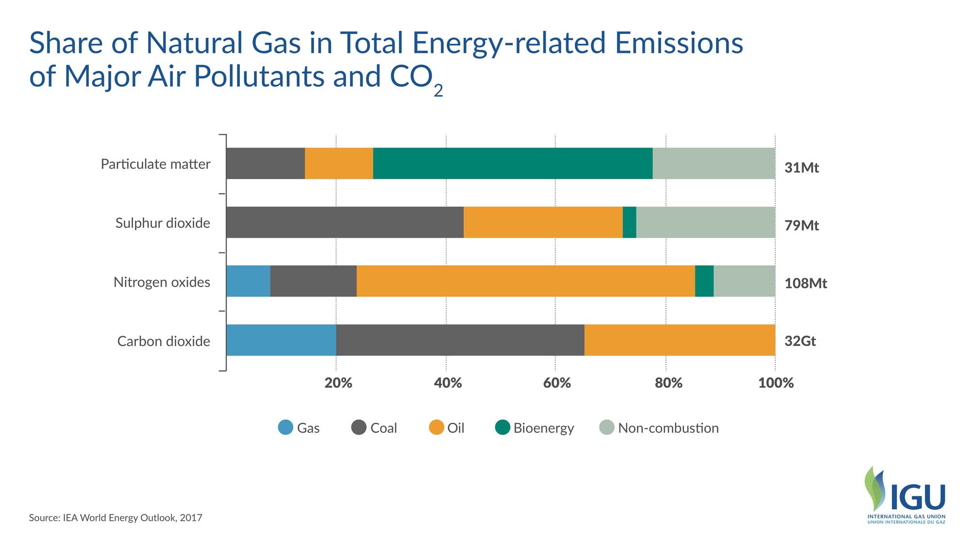 Unlike other fossil fuels, natural gas does not release ash residue or sulfur oxides, and only produces small amounts of nitrogen oxides and carbon dioxide. This makes natural gas an effective and safe alternative for industrial use, residential use, and electricity generation. According to the International Gas Union (IGU), natural gas produces half of the greenhouse gas emissions of coal and nearly one third less than oil when generating electricity.